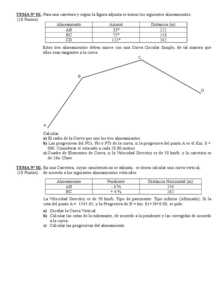 Para una carretera y según la figura adjunta se tienen los siguientes alineamientos: