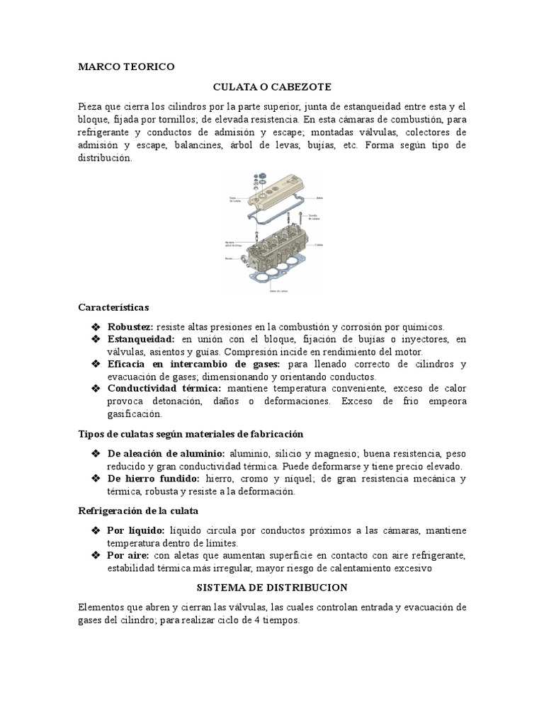 admisión y escape, balancines, árbol de levas, bujías, etc. Forma según tipo de