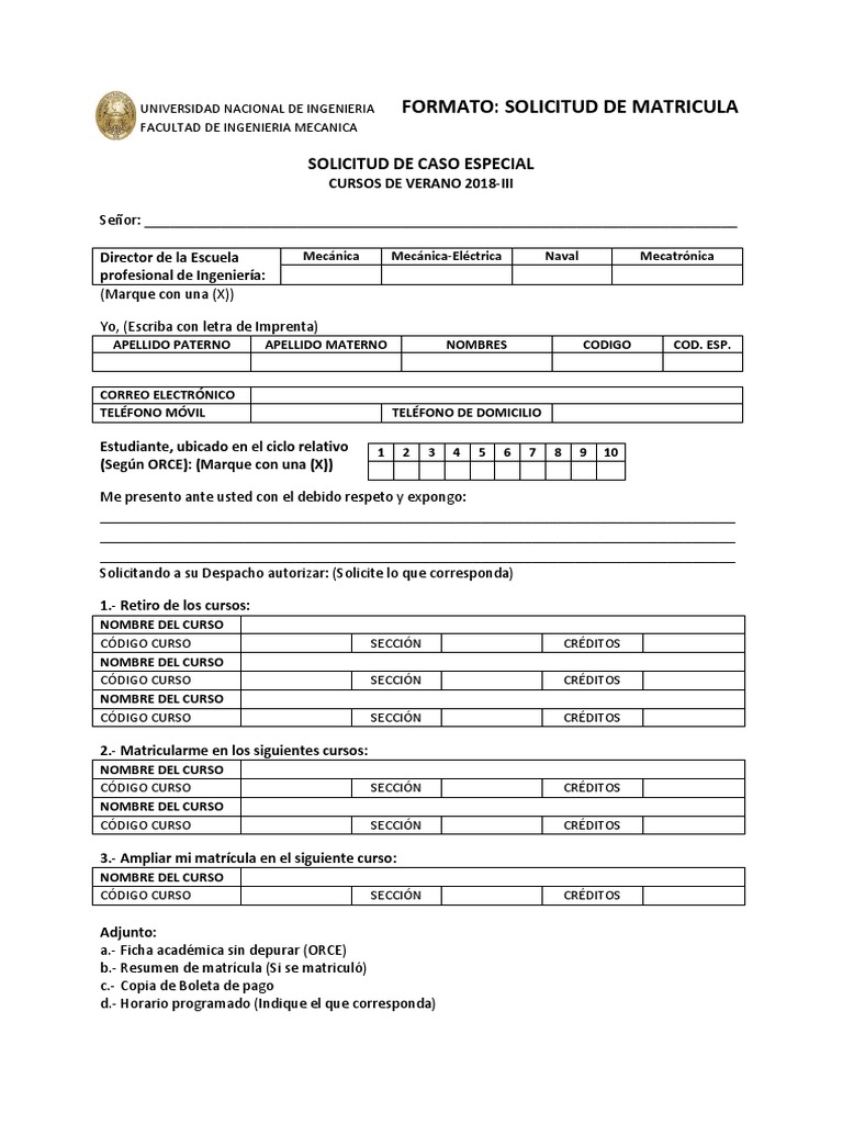 UNIVERSIDAD NACIONAL DE INGENIERIA FORMATO: SOLICITUD DE MATRICULA