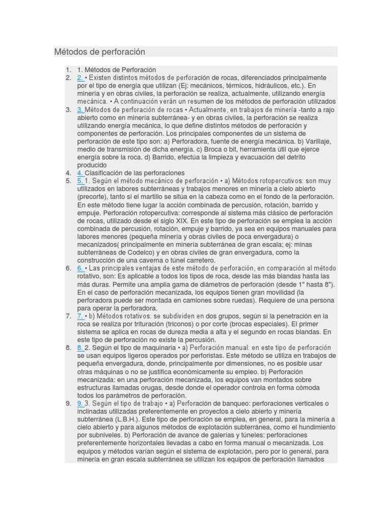 mecánica. • A continuación verán un resumen de los métodos de perforación utilizados