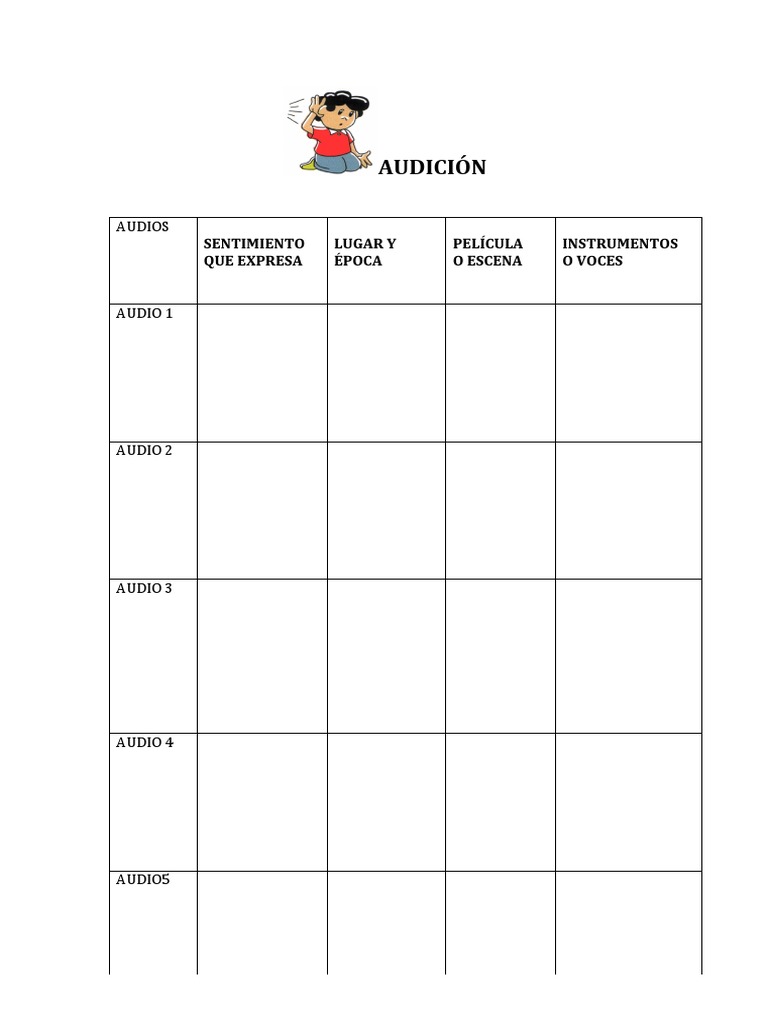 AUDIOS SENTIMIENTO LUGAR Y PELÍCULA INSTRUMENTOS QUE EXPRESA ÉPOCA O ESCENA O VOCES AUDIO 1 AUDIO 2 AUDIO 3 AUDIO 4 AUDIO5
