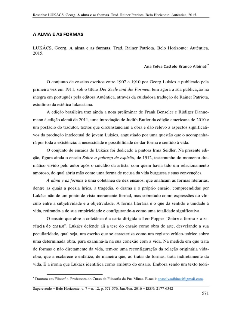 Resenha: LUKÁCS, Georg. A alma e as formas. Trad. Rainer Patriota. Belo Horizonte: Autêntica, 2015.