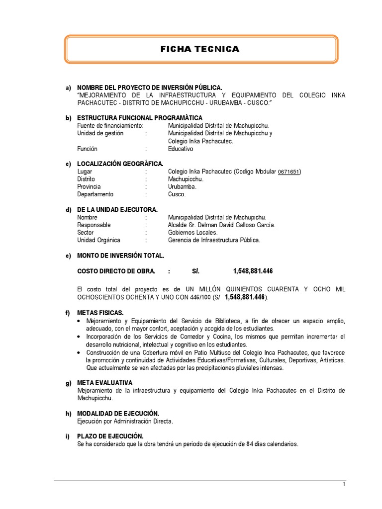 Mejoramiento de la infraestructura y equipamiento del Colegio Inka Pachacutec en el Distrito de