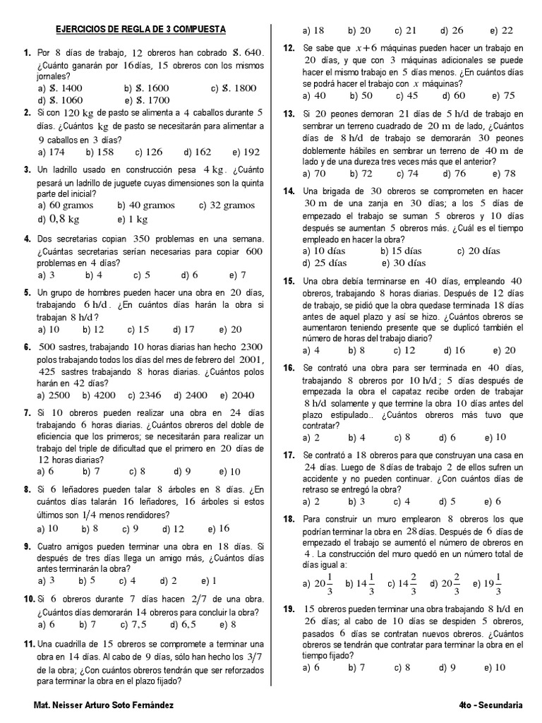 EJERCICIOS DE REGLA DE 3 COMPUESTA a) 18 b) 20 c) 21 d) 26 e) 22