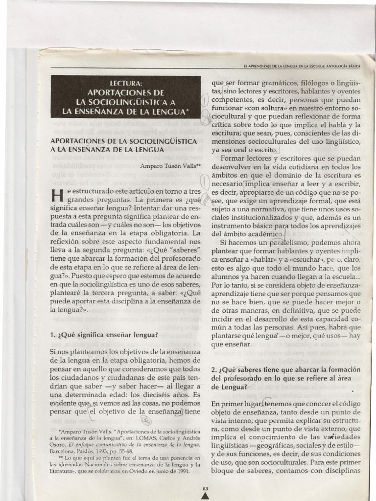 *Amparo Tusón Valls. "Aportaciones de la sociolingiiística ra, como desde un punto de vista externo, que