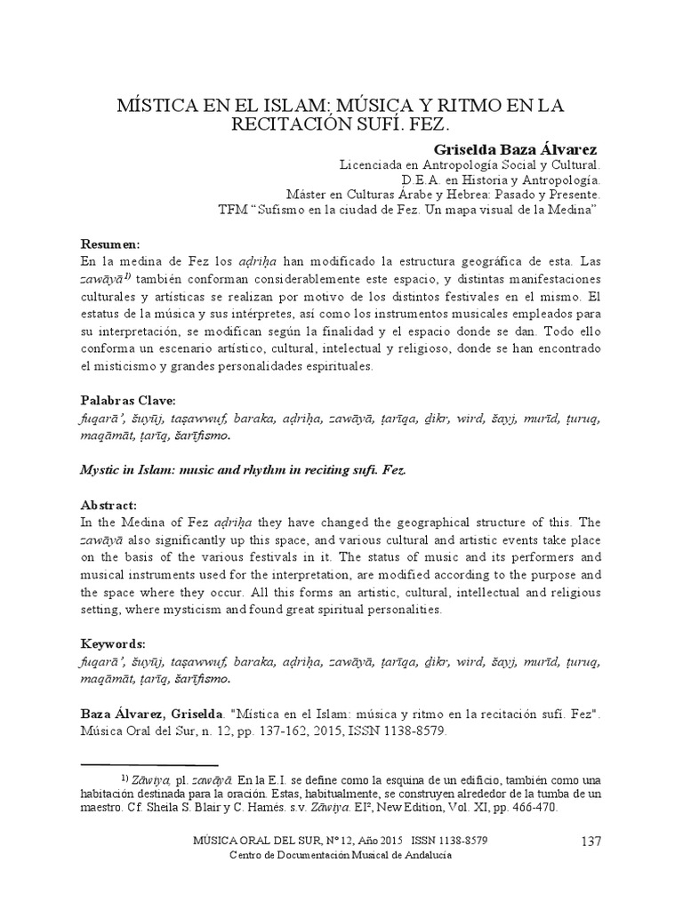 Baza Álvarez, Griselda. "Mística en el Islam: música y ritmo en la recitación sufí. Fez".