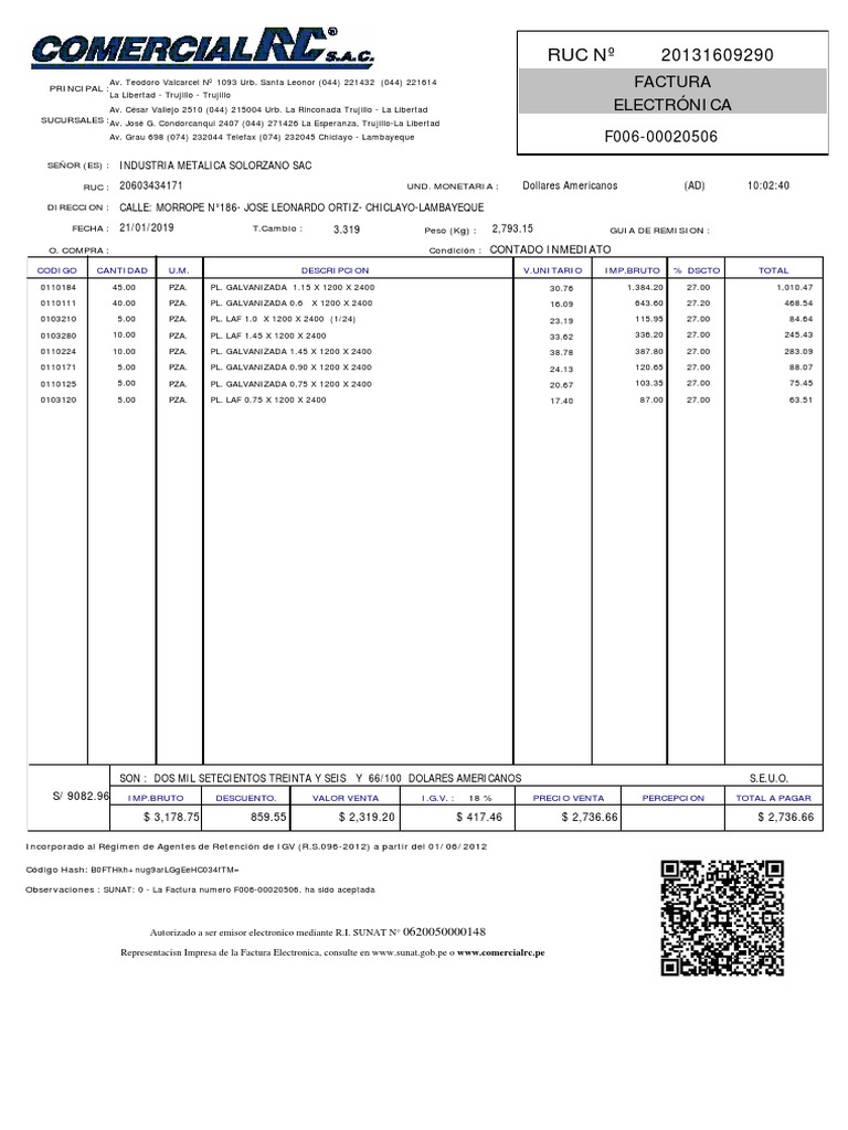 Observaciones : SUNAT: 0 - La Factura numero F006-00020506, ha sido aceptada