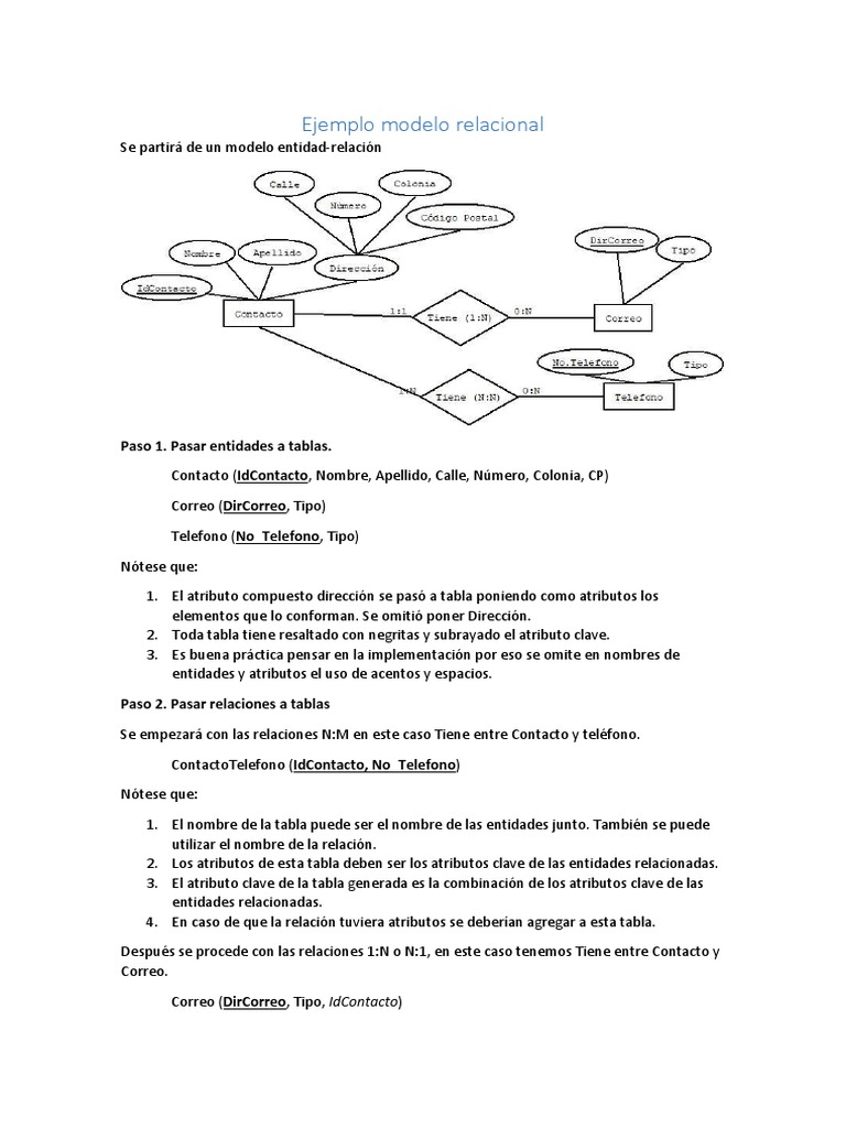 Contacto (IdContacto, Nombre, Apellido, Calle, Número, Colonia, CP)