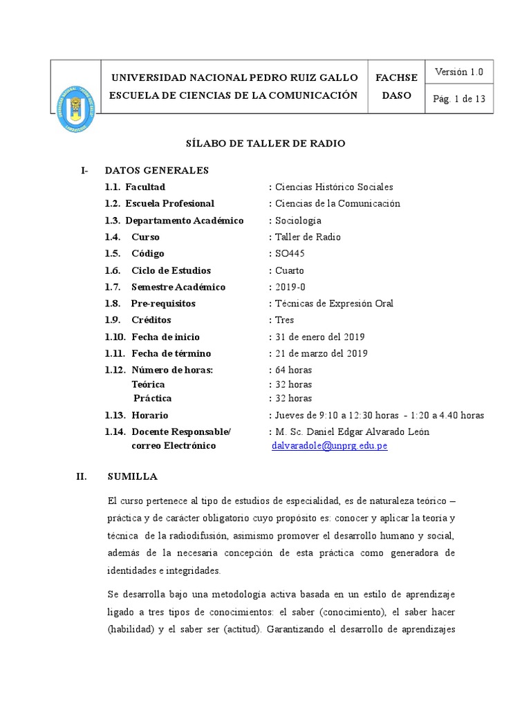 1.14. Docente Responsable/ : M. Sc. Daniel Edgar Alvarado León
