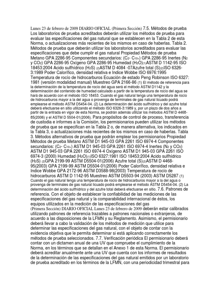 especificaciones que debe cumplir el gas natural Propiedad Métodos de prueba