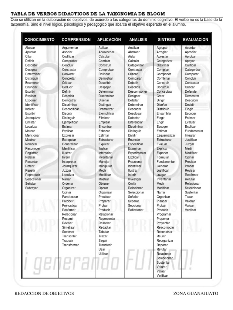 TABLA DE VERBOS DIDACTICOS DE LA TAXONOMIA DE BLOOM