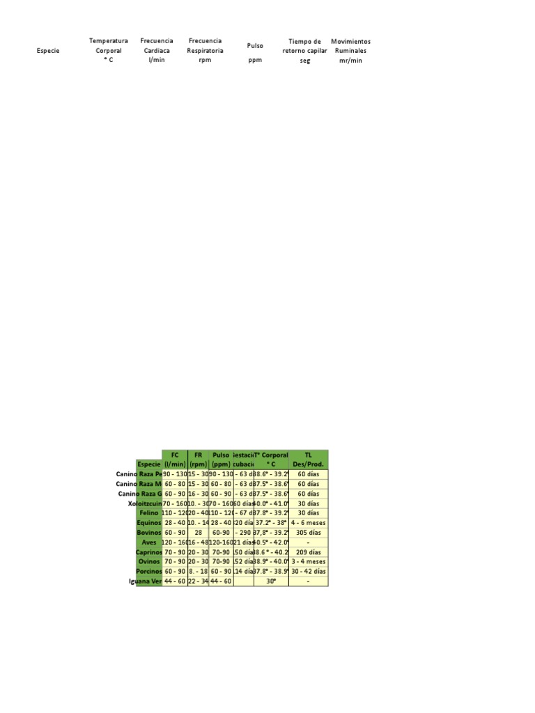 Especie Corporal Cardiaca Respiratoria retorno capilar Ruminales