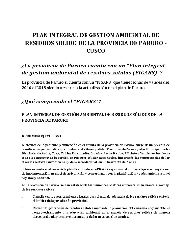 En la provincia de Paruro, se han establecido las siguientes políticas ambientales en cuanto al manejo