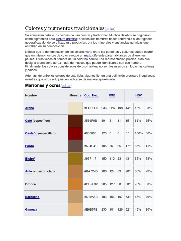 Se enumeran debajo los colores de uso común y tradicional. Muchos de ellos se originaron