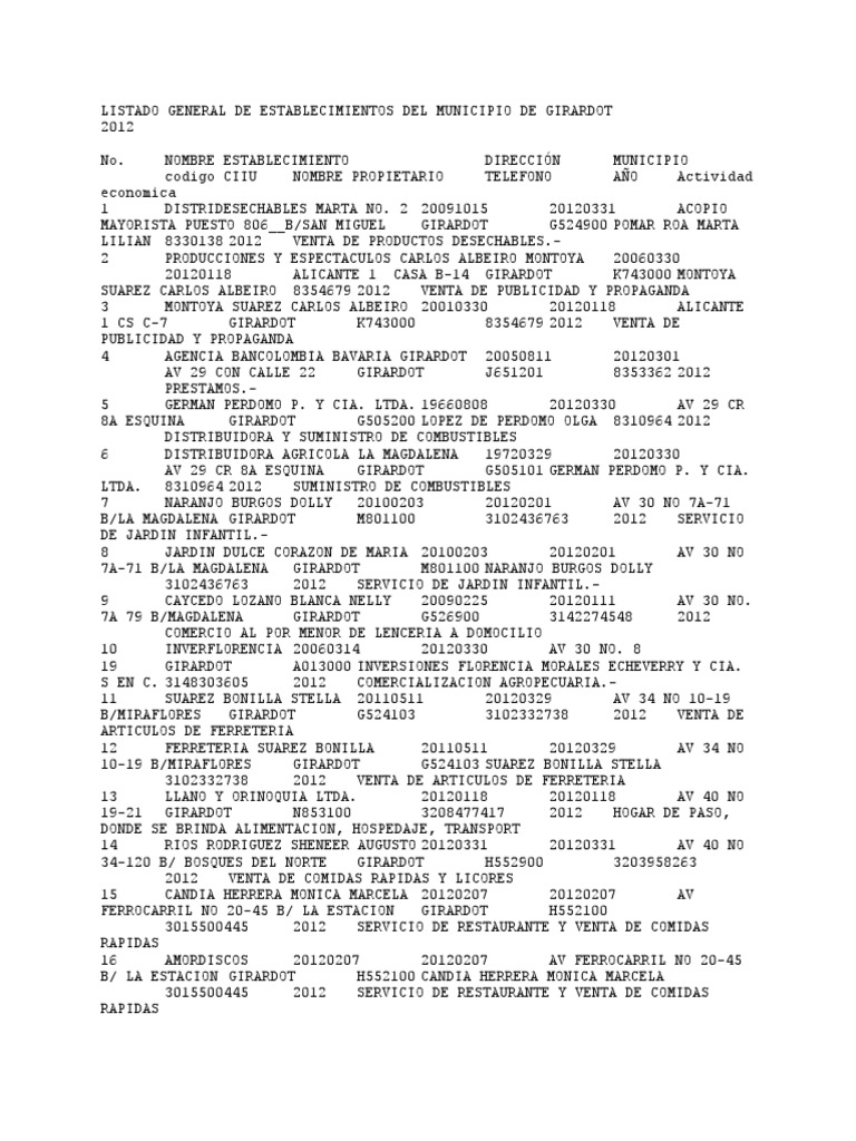 LISTADO GENERAL DE ESTABLECIMIENTOS DEL MUNICIPIO DE GIRARDOT