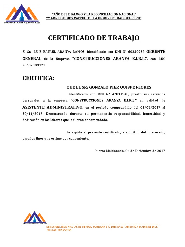 QUE EL SR: GONZALO PIER QUISPE FLORES