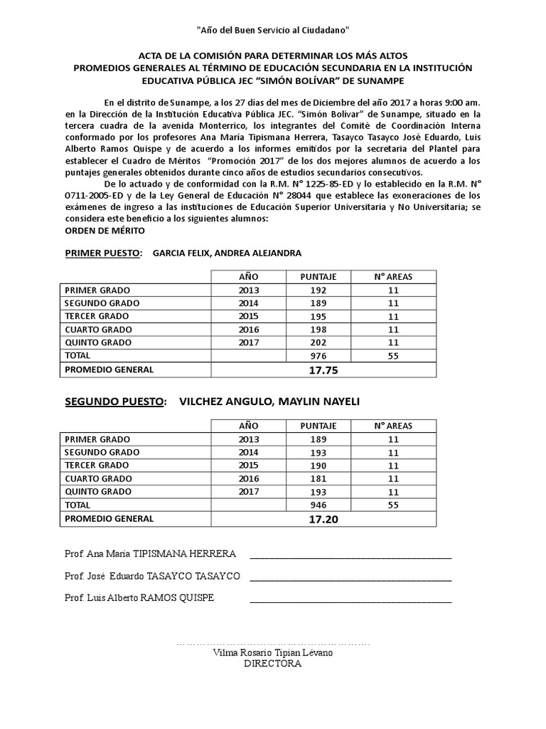 PRIMEROS PUESTOS DE LA INSTITUCIÓN EDUCATIVA “SIMÓN BOLÍVAR” DE SUNAMPE - 2017