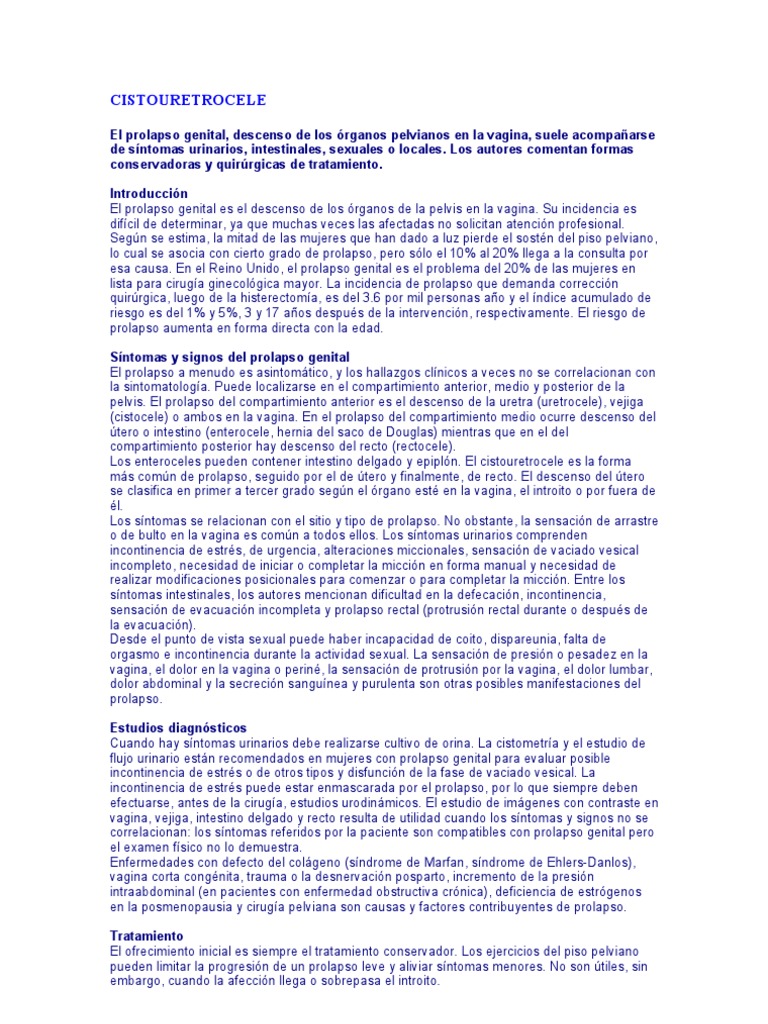 Los enteroceles pueden contener intestino delgado y epiplón. El cistouretrocele es la forma
