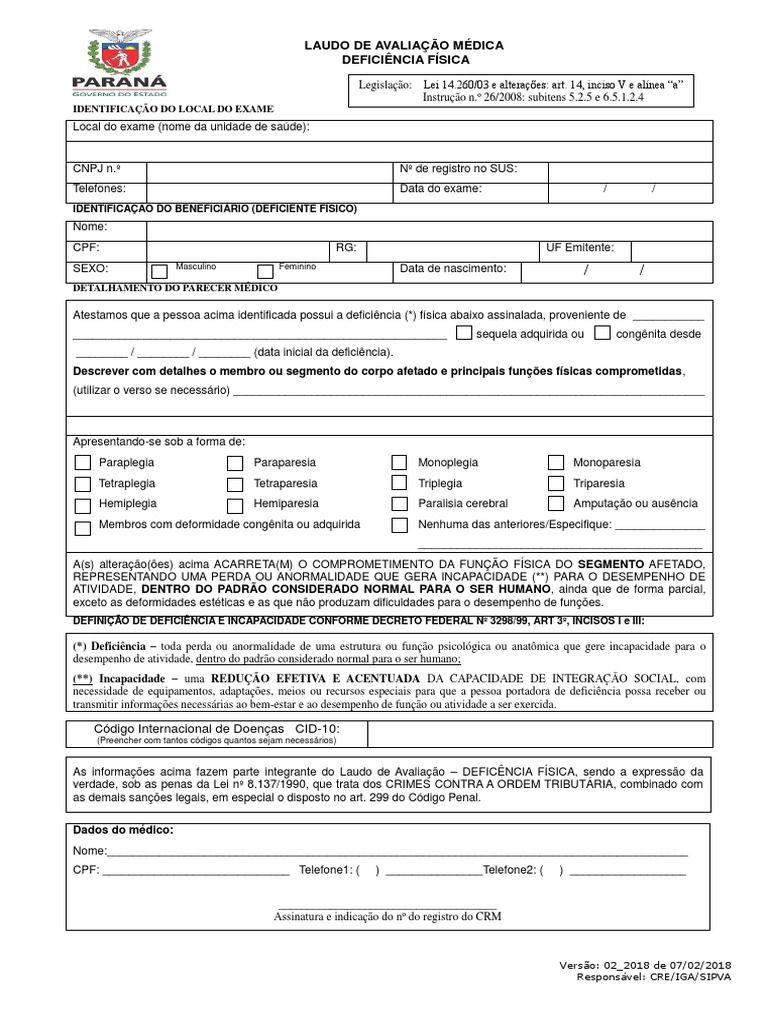 LAUDO DE AVALIAÇÃO MÉDICA DEFICIÊNCIA FÍSICA