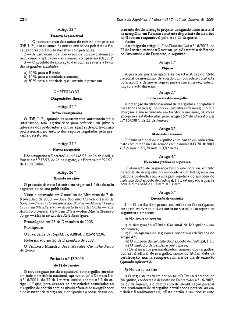O novo regime jurídico aplicável ao mergulho amador b) No verso contém: