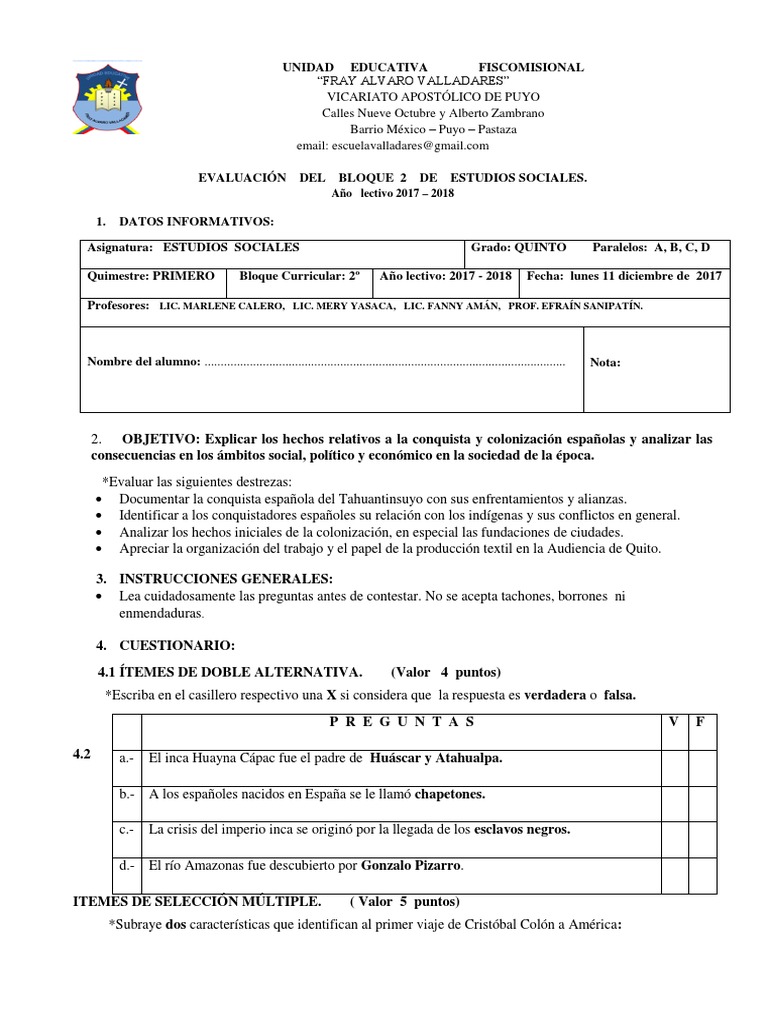 Asignatura: ESTUDIOS SOCIALES Grado: QUINTO Paralelos: A, B, C, D