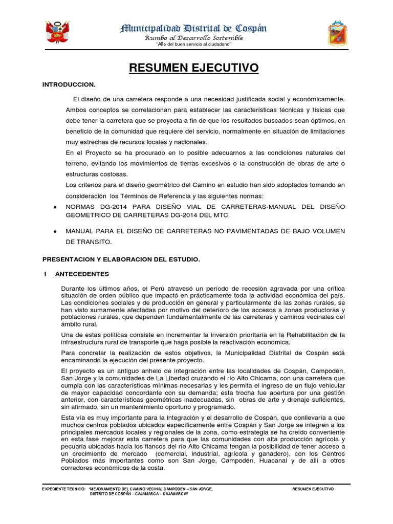 EXPEDIENTE TECNICO: “MEJORAMIENTO DEL CAMINO VECINAL CAMPODEN – SAN JORGE, RESUMEN EJECUTIVO