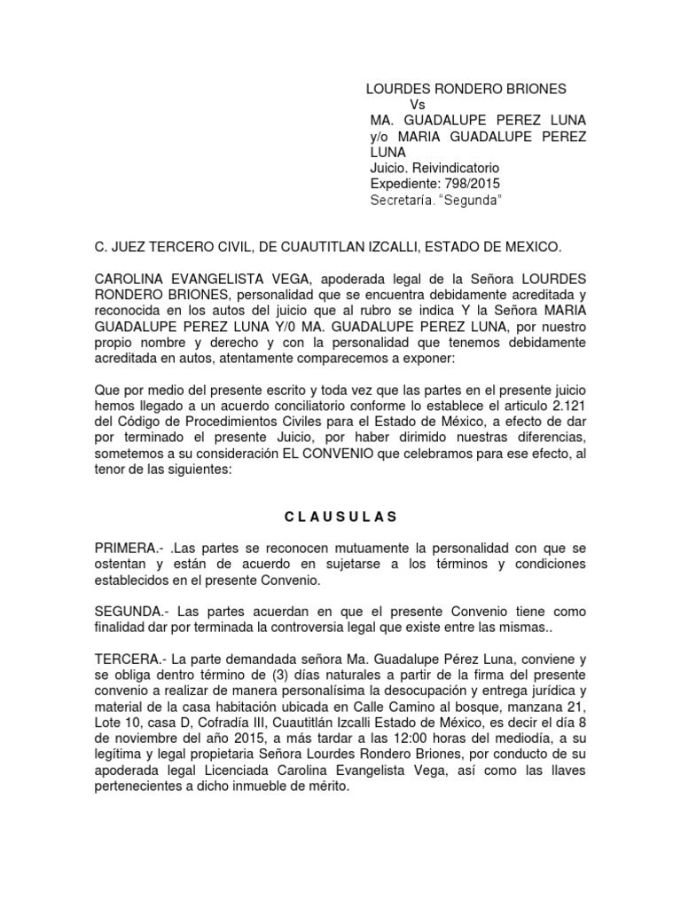 TERCERA.- La parte demandada señora Ma. Guadalupe Pérez Luna, conviene y