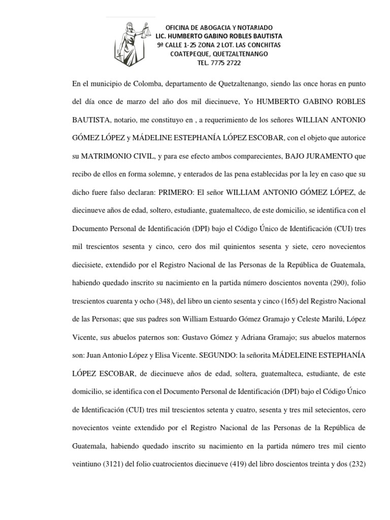 matrimonio civil con la señorita MÁDELEINE ESTEPHANÍA LÓPEZ ESCOBAR. Y responde