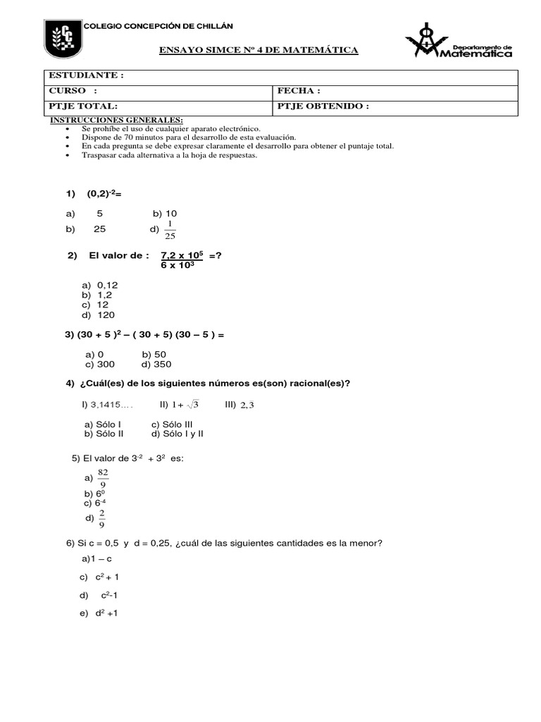 ENSAYO SIMCE Nº 4 DE MATEMÁTICA