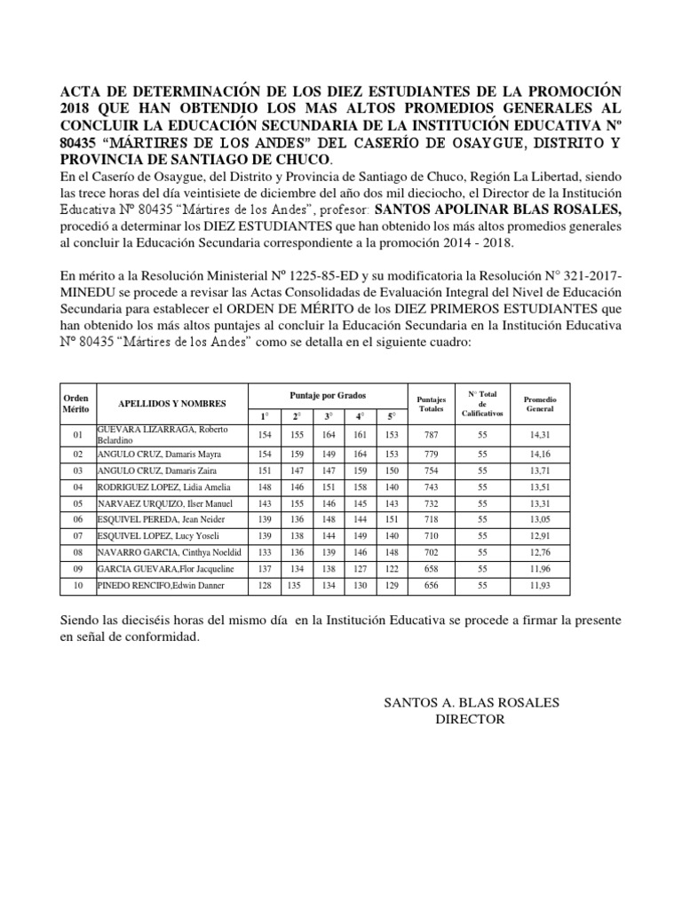 ACTA DE DETERMINACIÓN DE LOS DIEZ ESTUDIANTES DE LA PROMOCIÓN