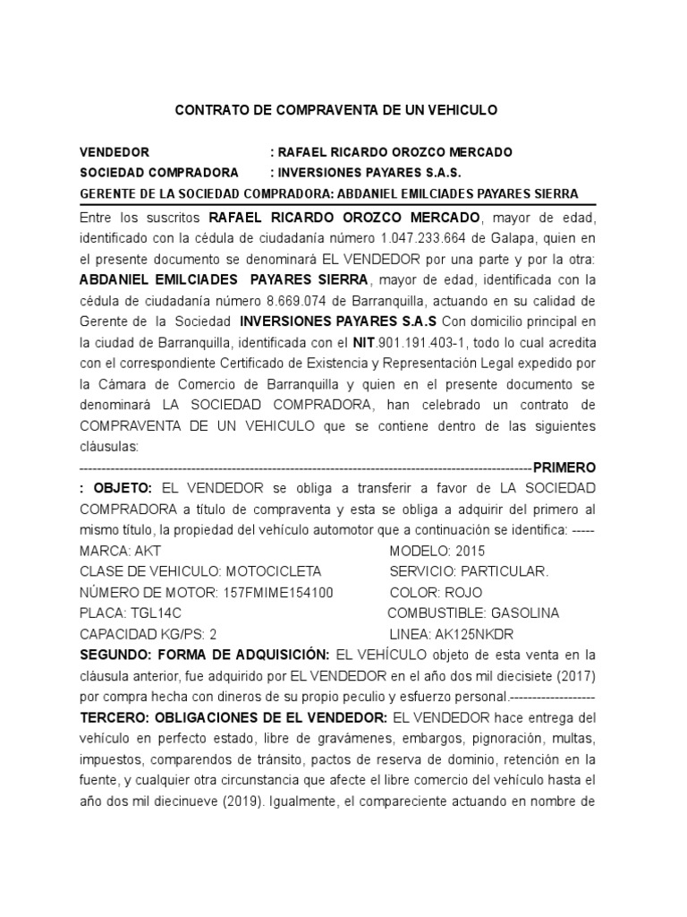 COMPRAVENTA DE UN VEHICULO que se contiene dentro de las siguientes