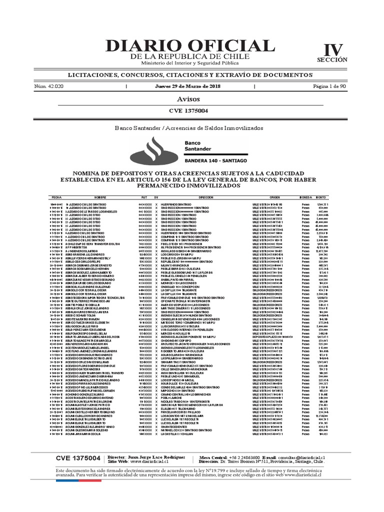 01-04-2015 ZUNIGA DIAZ ALEJANDRO ESTEFANO 1684XXXX X SIN DIRECCION 0000000001 SANTIAGO VALE VISTA 20355722741 Pesos 142.086
