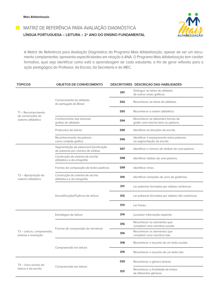 A Matriz de Referência para Avaliação Diagnóstica do Programa Mais Alfabetização, apesar de ser um docu-