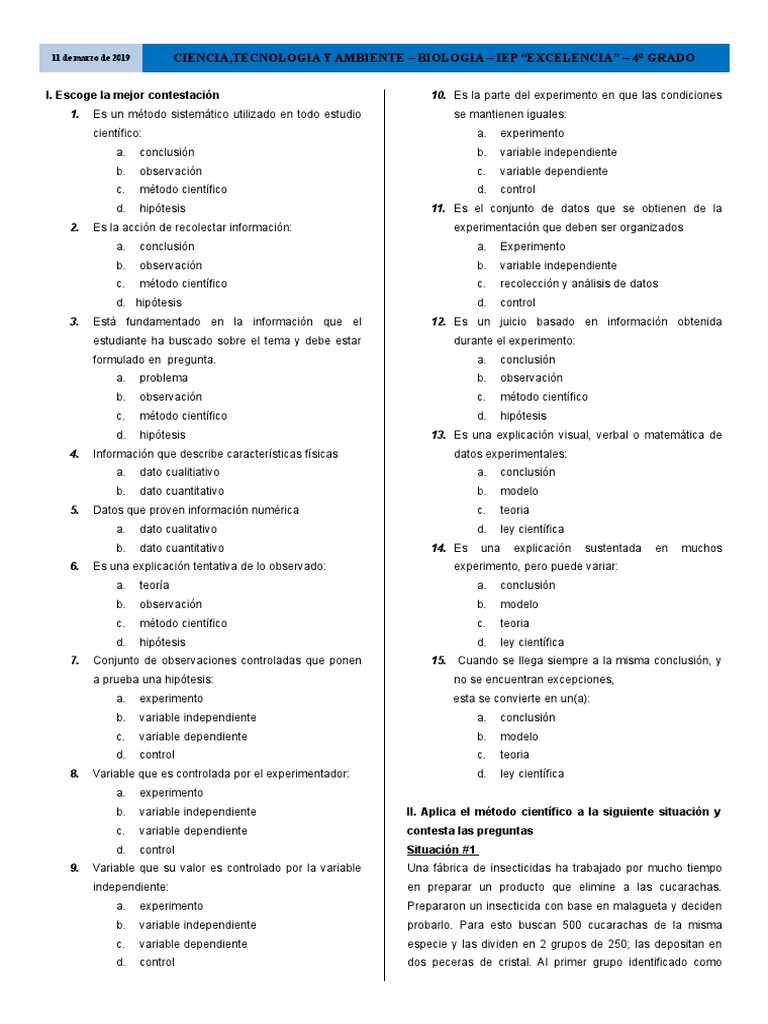 I. Escoge la mejor contestación 10. Es la parte del experimento en que las condiciones