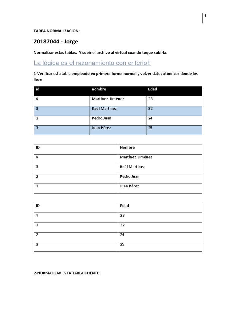 Normalizar estas tablas. Y subir el archivo al virtual cuando toque subirla.