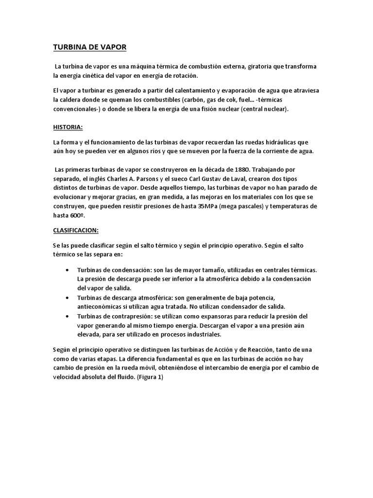 La turbina de vapor es una máquina térmica de combustión externa, giratoria que transforma