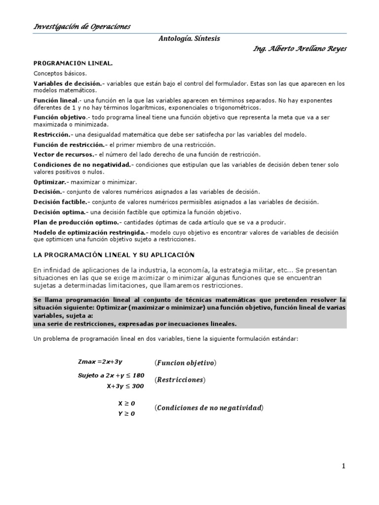 situación siguiente: Optimizar (maximizar o minimizar) una función objetivo, función lineal de varias