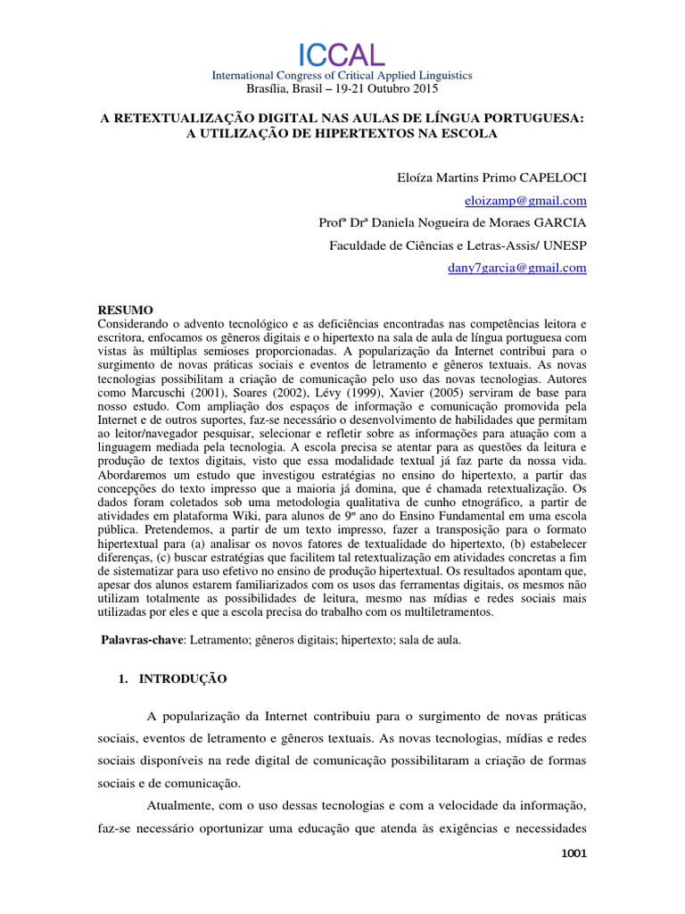 Portuguesa, por meio do estudo dos gêneros digitais e da utilização de hipertextos. Foi