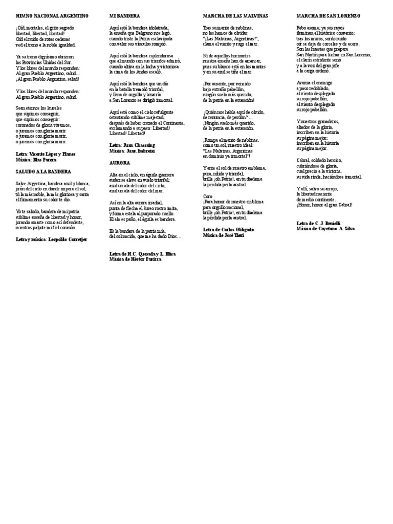 HIMNO NACIONAL ARGENTINO MI BANDERA MARCHA DE LAS MALVINAS MARCHA DE SAN LORENZO