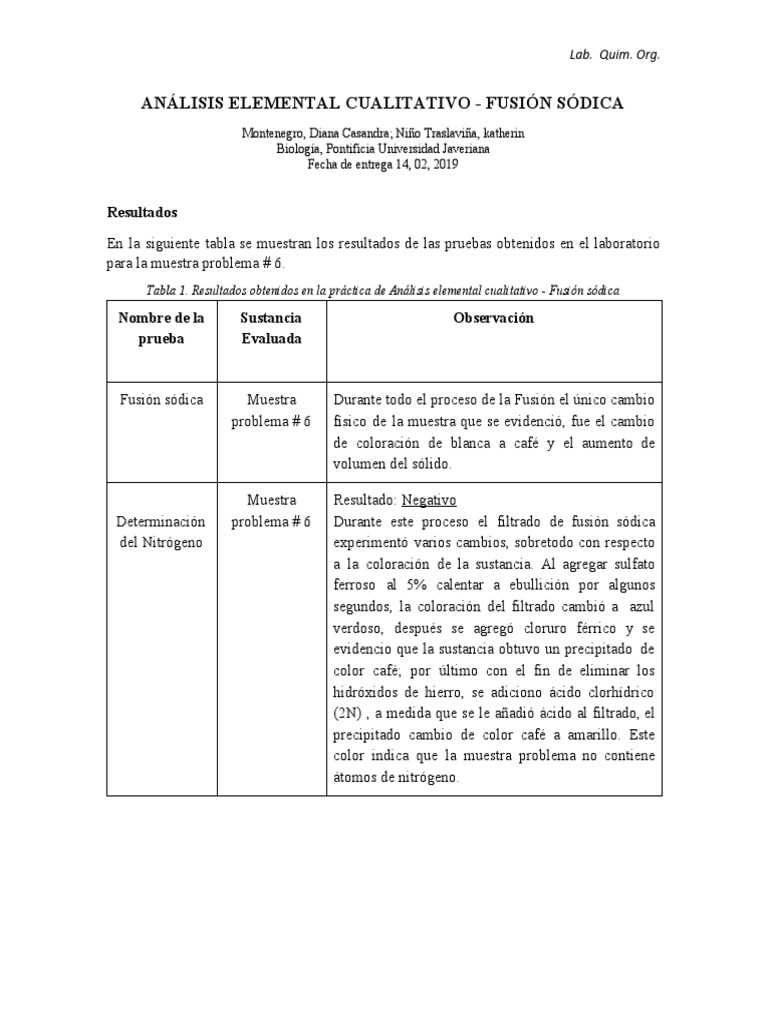 esultados obtenidos en la práctica de Análisis elemental cualitativo - Fusión sódica
