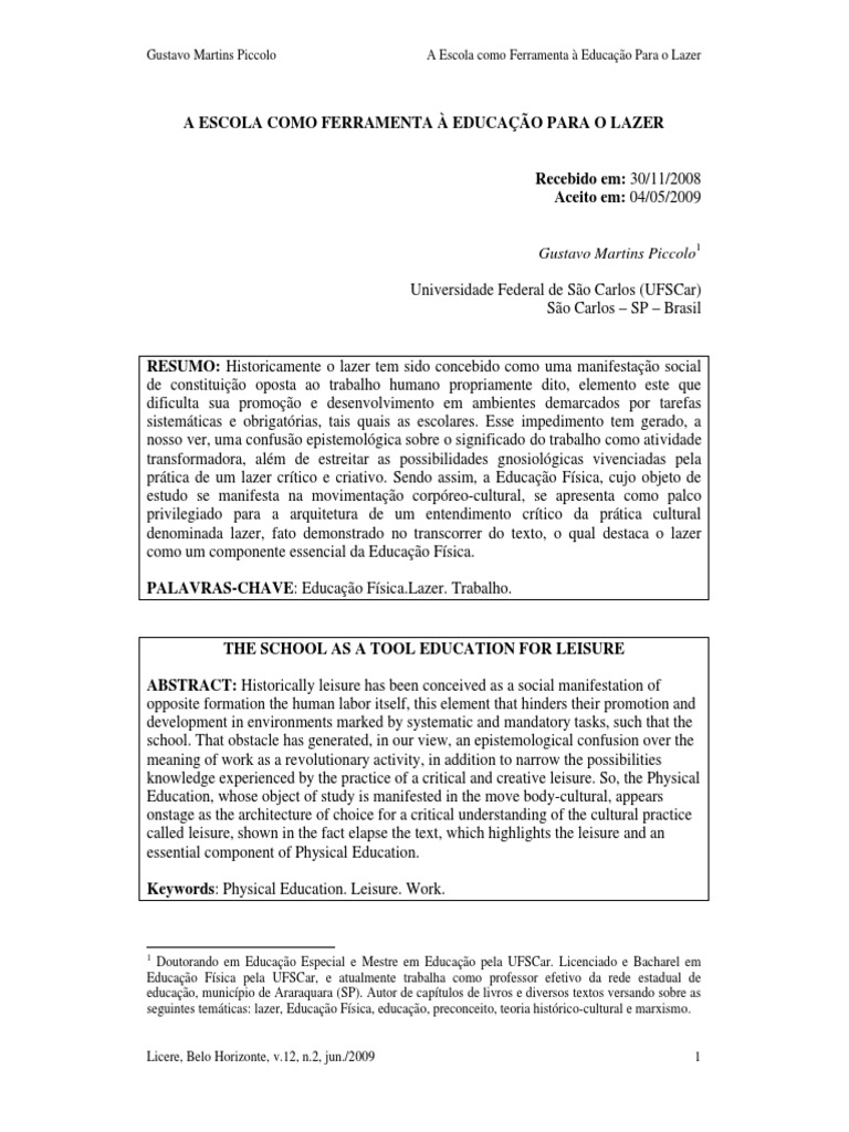Gustavo Martins Piccolo A Escola como Ferramenta à Educação Para o Lazer