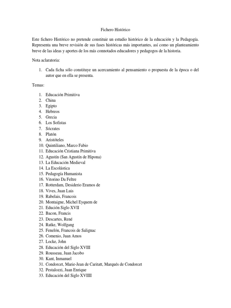Este fichero Histórico no pretende constituir un estudio histórico de la educación y la Pedagogía.