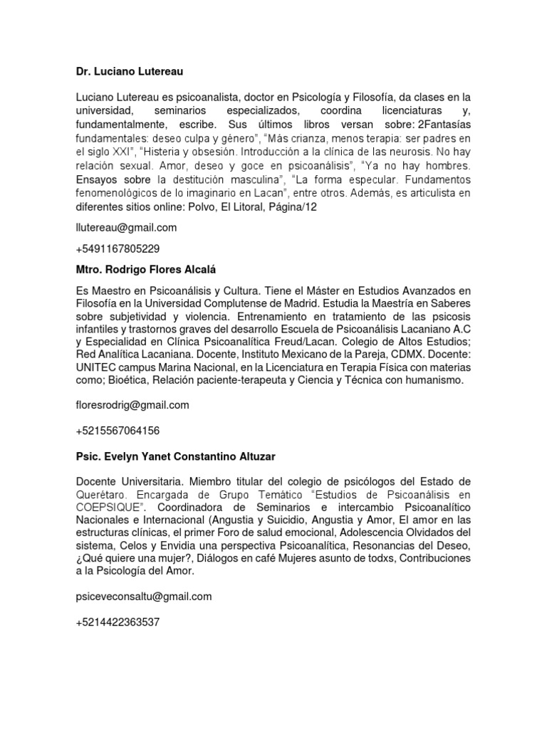y Especialidad en Clínica Psicoanalítica Freud/Lacan. Colegio de Altos Estudios;