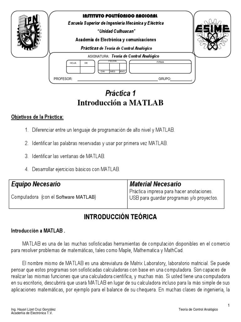 la versión estudiantil en casa. MATLAB se actualiza de manera regular; esta práctica se basa en MATLAB 7.