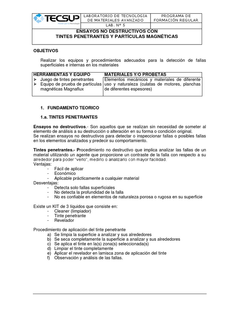 Tintes penetrantes.- Procedimiento no destructivo que implica analizar las fallas de un