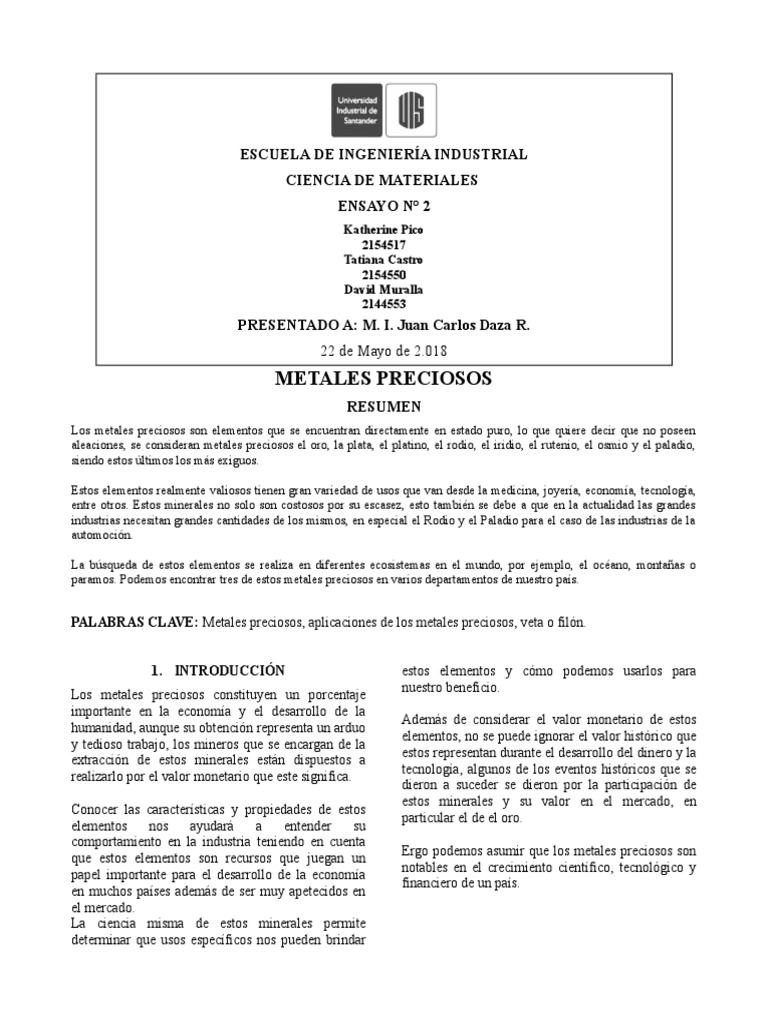 PALABRAS CLAVE: Metales preciosos, aplicaciones de los metales preciosos, veta o filón.