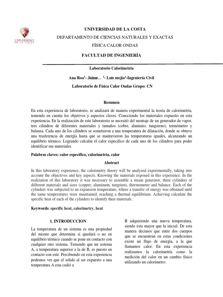Palabras claves: calor específico, calorimetría, calor