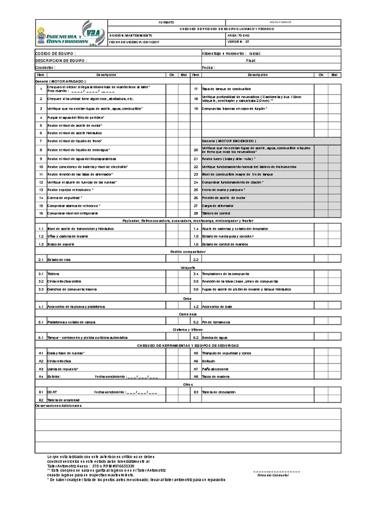 ** Este chequeo se hara en garita al ingreso o en el Taller Automotriz _ _ _ _ _ __ _ _ _ _ _ _ _ _ _ _ _