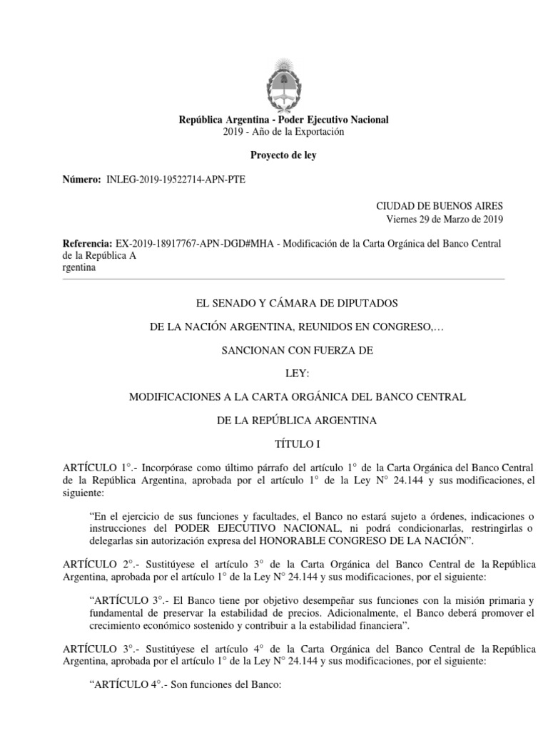 Referencia: EX-2019-18917767-APN-DGD#MHA - Modificación de la Carta Orgánica del Banco Central