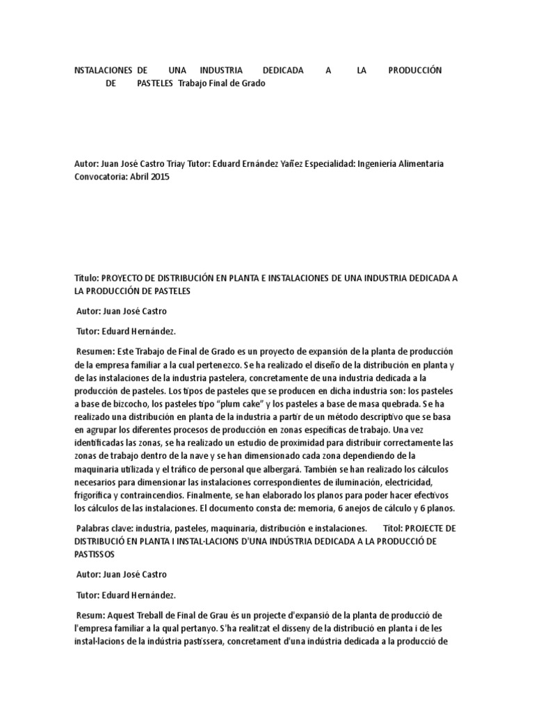 El objeto del presente proyecto es la instalación de una industria que elabora pasteles a base de